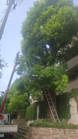 ハーネスを着用しツリークライミング技術により安全に高木剪定作業を行いました。